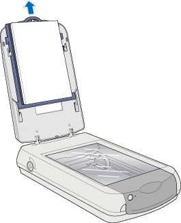Si está colocado el soporte para documentos reflectantes, tiene que retirarlo. Sujete la parte superior del soporte para documentos y luego deslícelo hacia arriba con cuidado.