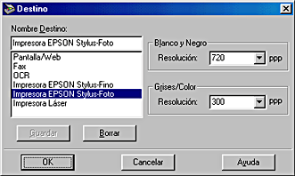 Si utiliza una impresora EPSON Stylus y desea imprimir imágenes escaneadas con los ajustes Económico, Normal o Fino de Resolución del software de la impresora, se recomienda seleccionar Impresora EPSON Stylus-Fino. Si está imprimiendo con los ajustes Superfino o Foto de Resolución, seleccione Impresora EPSON Stylus-Foto.