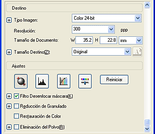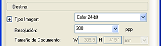 ![]() | Especifique el tipo de archivo de imagen resultante deseado con los ajustes de Destino. |
