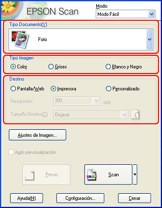 ![]() | En la ventana principal de EPSON Scan, configure los ajustes Tipo de documento, Tipo de imagen y Destino. |