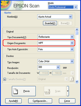 ![]() | En la ventana principal de EPSON Scan, compruebe que esté seleccionada la opción MPF (alimentador de varias fotos) en la lista Origen del documento, y luego elija los ajustes adecuados para escanear. |