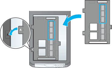 Si desea escanear las películas en la zona A del soporte para películas: Coloque el soporte para películas en la superficie para documentos, de forma que esté alineada con la esquina inferior izquierda de la superficie para documentos. Compruebe que la marca "A" de la lengüeta del soporte para películas coincida con la marca "A" del escáner y que la proyección de la lengüeta del soporte para películas encaje en el orificio del escáner.
