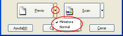 Cuando se hace clic en Previo, comienza el preescaneado y se previsualiza la imagen. Según el modo de escaneado y los ajustes de Tipo documento seleccionados, puede aparecer una flechita a la derecha del botón Previo, la cual le permite seleccionar un método de previsualización. Haga clic en la flecha y seleccione Miniaturas o Normal para cambiar el método de previsualización.