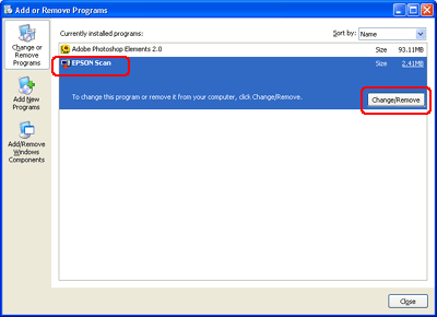 Seleccione EPSON Scan en la lista y haga clic en Cambiar o quitar (en Windows XP o 2000) o en Agregar o quitar (en Windows Me o 98 SE).