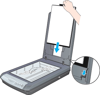 Coloque el documento en la superficie para documentos con la cara que desee escanear hacia abajo. Compruebe que la esquina superior derecha del documento esté alineada con la esquina superior derecha del escáner.