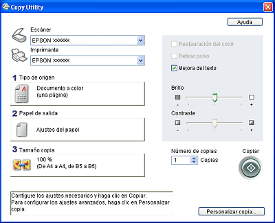 Utilice esta aplicación para convertir su escáner en una fotocopiadora digital, aunque sus funciones son mucho más potentes y flexibles que las de las fotocopiadoras convencionales. Con esta aplicación, puede escanear e imprimir imágenes en la forma de fotografías. Puede copiar en diversos tamaños, y colocar varias fotos en la misma página. Antes de imprimir una imagen, puede ver los efectos de los ajustes en la ventana de previsualización. Cuando inicie esta aplicación, aparecerá la siguiente pantalla.