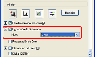 Si la imagen escaneada aparece granulada, seleccione la casilla de verificación Reducción de granulado y vuelva a hacer clic en SCAN para reducirlo. Cuanto más alto sea el nivel de Reducción de granulado seleccionado, más suave será la textura de la imagen escaneada.