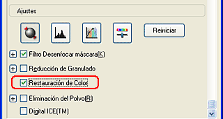 ![]() | Seleccione la casilla de verificación Restauración del color. (Quizás tenga que desplazarse al final de la pantalla.) |
