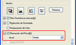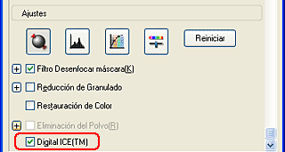 EPSON Scan ofrece dos funciones: Eliminación del polvo y Digital ICE.