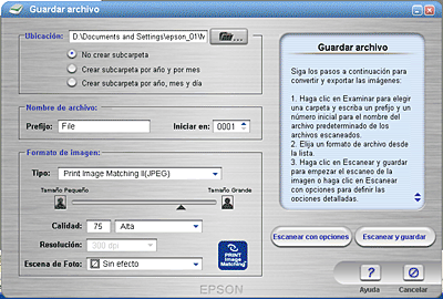 ![]() | Configure los ajustes de Ubicación, Nombre de archivo y Formato de imagen. Como tipo de formato de imagen, seleccione Print Image Matching II (JPEG) o Print Image Matching II (TIFF) en el cuadro de lista Tipo. |
