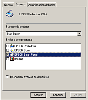 del escáner a cualquier otra aplicación que no sea EPSON Smart Panel y que admita sucesos de escáner (por ejemplo, Microsoft Imaging para Windows, siempre y cuando esté instalada). Cuando pulse el botón Iniciar
