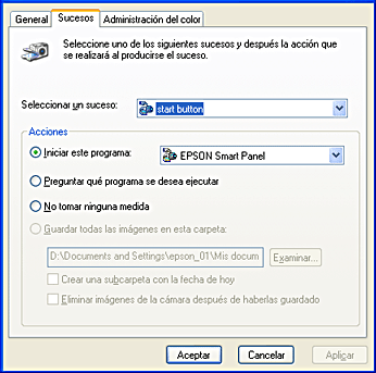 Elija el botón que desee en la lista Sucesos de escáner, luego seleccione la casilla de verificación de la aplicación deseada en la lista Enviar a este programa, y desmarque el resto de casillas de verificación.