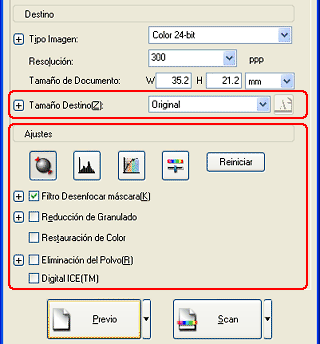 Cuando ya está determinado el tamaño de salida de la imagen escaneada, seleccione un ajuste adecuado en la lista Tamaño destino. En la ventana Previo, aparece un marco proporcional a las medidas del ajuste Tamaño destino. Puede desplazar este marco a la zona de la imagen que desee escanear. Si desea más detalles, consulte la ayuda on-line.