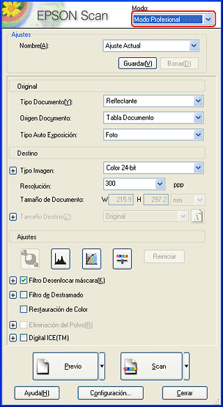 Inicie EPSON Scan y seleccione el modo Profesional. Si desea más instrucciones sobre cómo seleccionar un modo de escaneado, consulte Cambio del modo de escaneado.