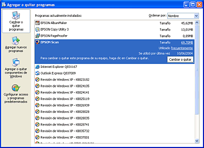 ![]() | Seleccione EPSON Scan en la lista y haga clic en Cambiar o quitar (en Windows XP o 2000) o en Agregar o quitar (en Windows Me o 98 SE). |