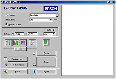Después de seleccionar el Tipo imagen, haga clic en Previo para iniciar el pre-escaneado. En pantalla aparece una imagen previsualizada del documento. Cuando está seleccionada la casilla de verificación Previo automático del cuadro de diálogo Configuración, se presentará en pantalla una imagen previsualizada nada más iniciar EPSON TWAIN.