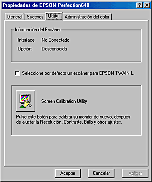 Haga clic en el icono EPSON Screen Calibration de la carpeta del escáner EPSON y se abrirá el cuadro de diálogo Screen Calibration.