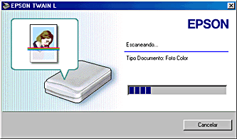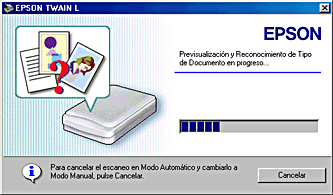 ![]() | Aparecerá la siguiente ventana con una barra de progreso para indicar en avance del escaneado. Puede ver el tipo de documento que se está escaneando. Si está escaneando varias fotografías, también puede ver el número de la imagen escaneada. |