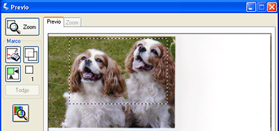 Después de seleccionar los ajustes básicos y la resolución en el modo Fácil o Profesional, puede previsualizar la imagen y seleccionar o ajustar el área de la imagen o imágenes que desee escanear. Epson Scan muestra una vista previa de las imágenes en una ventana de previsualización.