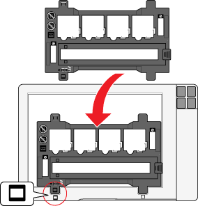 Coloque el soporte para películas en la superficie para documentos, de forma que esté alineado como se indica. Compruebe que la etiqueta con el icono de una diapositiva del soporte para películas encaje en la zona del escáner que tiene el mismo icono.