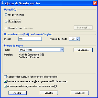 Si ha empezado el escaneado con Epson Scan como un programa independiente en el Modo Automático, la imagen escaneada se guardará en el formato de archivo y en la ubicación que eligió. Si no ha seleccionado ningún ajuste de guardado de archivo, se guardará como un archivo JPEG en Imágenes o Mis imágenes.