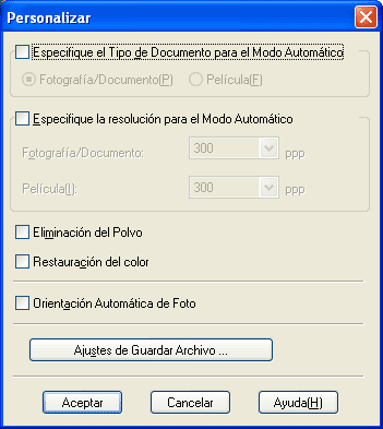 El Modo Automático es el más indicado para escanear documentos o fotos al tamaño 100% y si no necesita una previsualización de las imágenes antes de escanearlas. Puede recuperar los colores desvaídos o quitar las marcas de polvo haciendo clic en el botón Personalizar. Encontrará las instrucciones para escanear en este modo en Uso del Modo Automático.