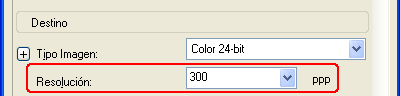 Si va a escanear las imágenes al 100% de su tamaño o menos y no las va a aumentar después, puede aceptar el ajuste de Resolución seleccionado por Epson Scan a partir de sus ajustes de Destino (sólo en Modo Fácil).