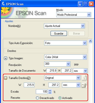 ![]() Si va a escanear la imagen a un tamaño en particular, deberá seleccionar el ajuste de Tamaño Destino después de previsualizarla, pero antes de ajustar el área de escaneado (indicada por el marco). Así se ajusta el área de escaneado con las proporciones correctas para que la imagen no se recorte de forma incorrecta.