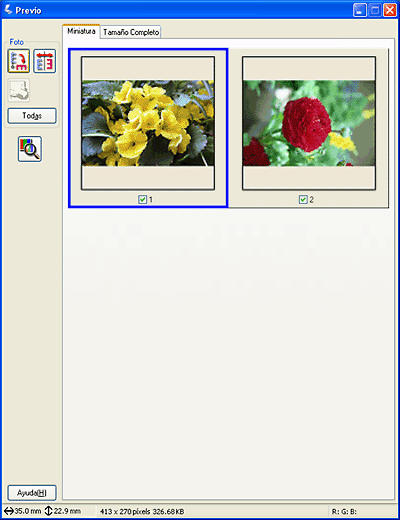 Previsualización a tamaño completomuestra las imágenes enteras. Tiene que seleccionar el área de escaneado y ajustar la calidad de la imagen de forma manual.
