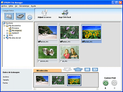 Iniciar en el Modo Fácil o Modo Profesional, verá la ventana Ajustes de Guardar Archivo. Aquí puede seleccionar el nombre y la ubicación de sus archivos de escaneado guardados. Si desea más información, consulte Selección de los Ajustes de Guardar Archivo. Cuando haya finalizado el escaneado, verá las miniaturas de sus imágenes escaneadas en la ventana Epson File Manager.Si desea utilizar sus imágenes escaneadas en un programa de proyectos de Epson Creativity Suite, haga clic en la casilla de verificación situada bajo cada miniatura de imagen. Las imágenes aparecerán en el cuadro Mi selección de la parte inferior de la ventana de Epson File Manager.