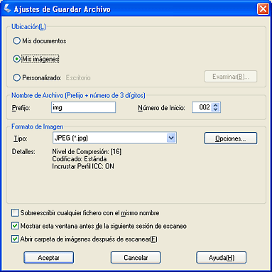 Si ha empezado el escaneado con Epson Scan como un programa independiente (en el Modo Automático), la imagen escaneada se guardará en el formato de archivo y en la ubicación que eligió. Si no ha seleccionado ningún ajuste de guardado de archivo, se guardará como un archivo JPEG en la carpeta Imágenes o Mis imágenes.