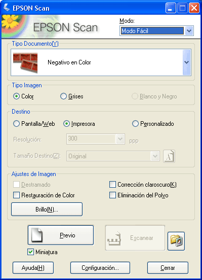 El Modo Fácil es el más indicado para acceder a vistas previas de las fotos, películas o diapositivas antes de escanearlas. Puede cambiar el tamaño de la imagen mientras la escanea, ajustar el área de escaneado y configurar muchos ajustes de la imagen, como la restauración del color, Digital ICE Technology (sólo para películas y diapositivas a color) o la corrección de claroscuro. Encontrará las instrucciones para pasar al Modo Fácil en Cambio del modo de escaneado. En Selección de los ajustes básicos se describen los pasos para escanear.