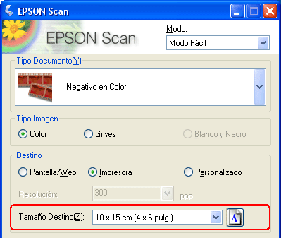 Si va a aumentar las imágenes en Epson Scan para poder usarlas con un tamaño mayor, puede aceptar el ajuste de Resolución seleccionado por Epson Scan a partir de sus ajustes de Destino (sólo en el Modo Fácil).