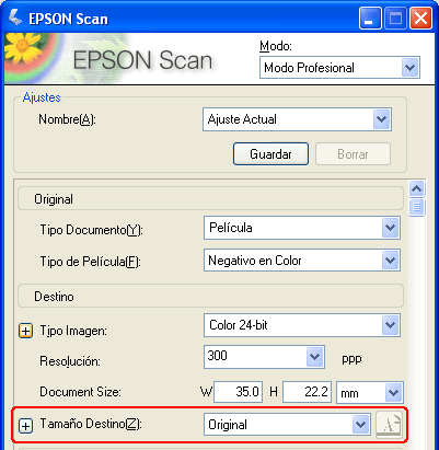 ![]() Si va a escanear la imagen a un tamaño en particular, deberá seleccionar el ajuste de Tamaño Destino después de previsualizarla, pero antes de ajustar el área de escaneado (indicada por el marco). Así se ajusta el área de escaneado con las proporciones correctas para que la imagen no se recorte de forma incorrecta.
