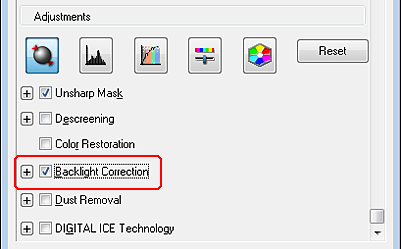 Arreglo del claroscuro de las fotosCon la función Backlight Correction (Corrección claroscuro) de Epson Scan, puede quitar las sombras de las fotos que tengan demasiada luz de fondo. Puede arreglar fotos impresas, películas o diapositivas automáticamente mientras las escanea.