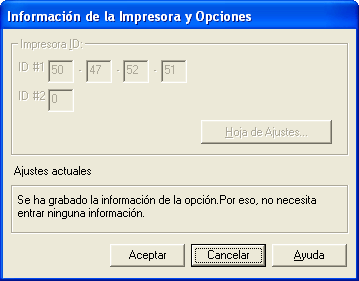 Segn cmo est configurado el sistema, los datos mostrados en el cuadro de dilogo Informacin de la impresora y opciones se actualizarn automticamente o tendr que introducirlos manualmente.
