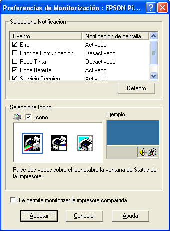 Haga clic en este botn para abrir el cuadro de dilogo Preferencias de monitorizacin, que permite ajustar EPSON Status Monitor 3.