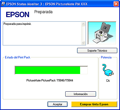 Si el cartucho fotográfico instalado en la impresora está roto o está mal instalado, EPSON StatusMonitor no mostrará un estado correcto del PicturePack. Sustituya o vuelva a instalar el cartucho fotográfico.