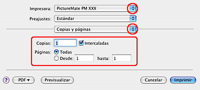 Seleccione la impresora que esté utilizando en el ajuste Impresora. Después, configure los ajustes de Copias y páginas.