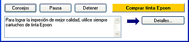 ConsejosEn el cuadro de texto situado en la parte inferior de la ventana del contador de avance, aparecen sugerencias para aprovechar al máximo el controlador de impresora Epson. Si desea saber más sobre la sugerencia que aparece en pantalla, haga clic en el botón Detalles.