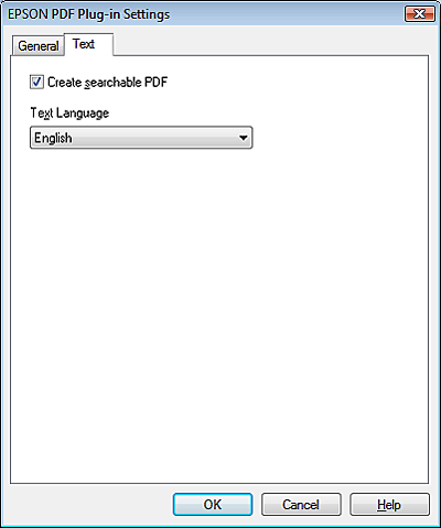 Para crear un archivo PDF con capacidad de búsqueda, haga clic en la ficha Text (Texto), seleccione la casilla de verificación Create searchable PDF (Crear PDF con capac. de búsqueda) y después seleccione su idioma en la lista Text Language (Idioma del Texto).