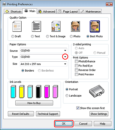 Haga una prueba de impresión en otro CD/DVD, espere 24 horas y revise la superficie impresa, sobre todo si va a imprimir una gran cantidad de CD/DVD.