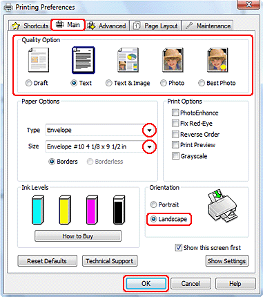 Seleccione el tamaño de sobre adecuado en Paper Size (Tamaño papel). También puede definir un tamaño de sobre personalizado. Si desea más detalles, consulte la Ayuda on-line.