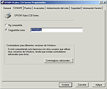 Si desea supervisar el estado de una impresora compartida, tendrá que instalar EPSON Status Monitor 3 en cada uno de los ordenadores que vayan a acceder a la impresora. Consulte las instrucciones en Instalar EPSON Status Monitor 3.