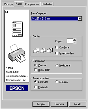 Utilice el menú Papel para cambiar el tamaño del papel, especificar el número de copias y otros parámetros, especificar la orientación del papel y ajustar el área imprimible.