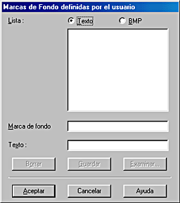 También puede añadir a la lista Marca de fondo sus propias marcas de fondo basadas en texto o en imagen. Para añadir una marca de fondo, haga clic en el botón Definido por el usuario. Aparecerá el siguiente cuadro de diálogo.