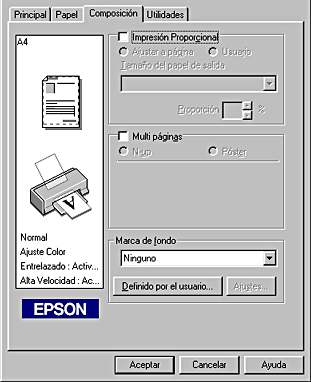 El menú Composición permite ajustar la Impresión proporcional, Multi páginas y Marca de fondo. Consulte la sección correspondiente más abajo.