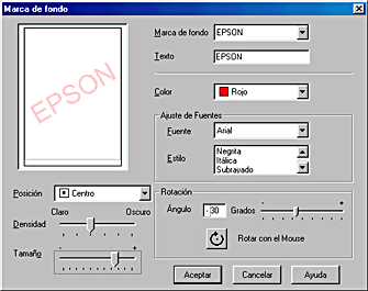 ![]() | Asegúrese de haber elegido la marca correcta en el cuadro de lista Marca de fondo y ajuste los valores de Color, Posición, Densidad, Tamaño, Fuente, Estilo y Ángulo. (Para más detalles, consulte la ayuda en pantalla.) Los ajustes que defina aparecerán en la parte izquierda del cuadro de diálogo. |