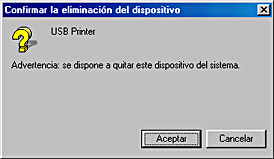 Bajo Otros dispositivos, seleccione Impresora USB, EPSON Stylus C40 Series o EPSON Stylus C20 Series. Después, haga clic en Quitar. Haga clic en Aceptar.