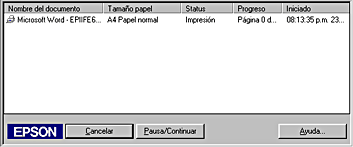 EPSON Spool Manager es parecido al Administrador de impresión de Windows. Si recibe dos o más trabajos de impresión a la vez, los coloca en una cola (con impresoras en red, la llamada cola de impresión) según el orden de llegada. Cuando un trabajo de impresión llega al principio de la cola, EPSON Spool Manager lo envía a la impresora. Puede cancelar trabajos de impresión desde Spool Manager. También puede ver información sobre el estado de la impresión de los trabajos enviados a la impresora, así como hacer una pausa, reanudar o reiniciar los trabajos de impresión seleccionados.